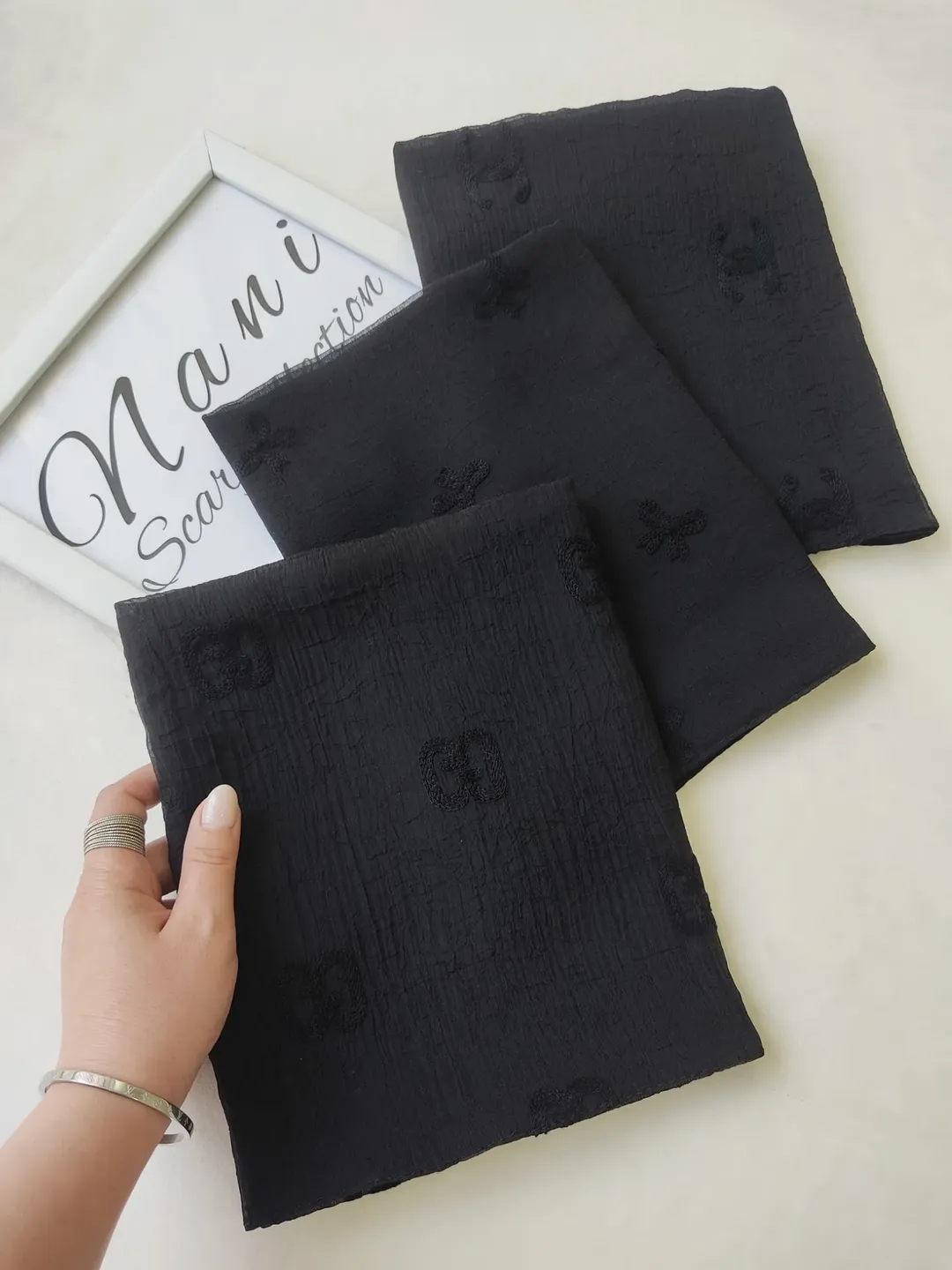 شال حریر نخ مشکی طرح دار